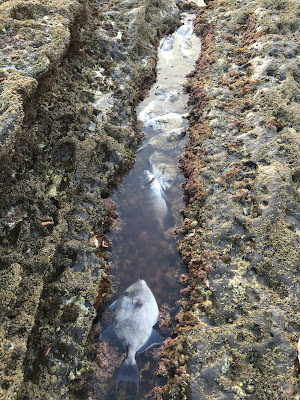 En esta jornada buscamos un escenario con bajos, pasos, pozos y caños donde tener algo de color ante la escasa mar. Aprovechamos la pleamar temprana y tentamos a los espáridos en poca agua donde el macizo de sardina funciona a la perfección.