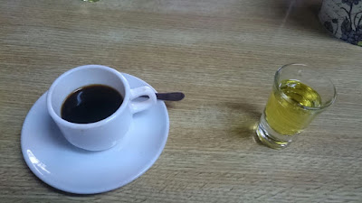 Para finalizar un "cafecito" para capear el madrugón antes de que nos pegue la mosca. Y por si alguno pudiera tener reparo en degustar estas viandas porque suban colesterol o similar, se toma usted un par de txupitos diluyentes de agua de fuego, y aquí paz y después gloria ;-) Estas cosas, como el buen humor no pueden faltar nunca, ¡jeje!